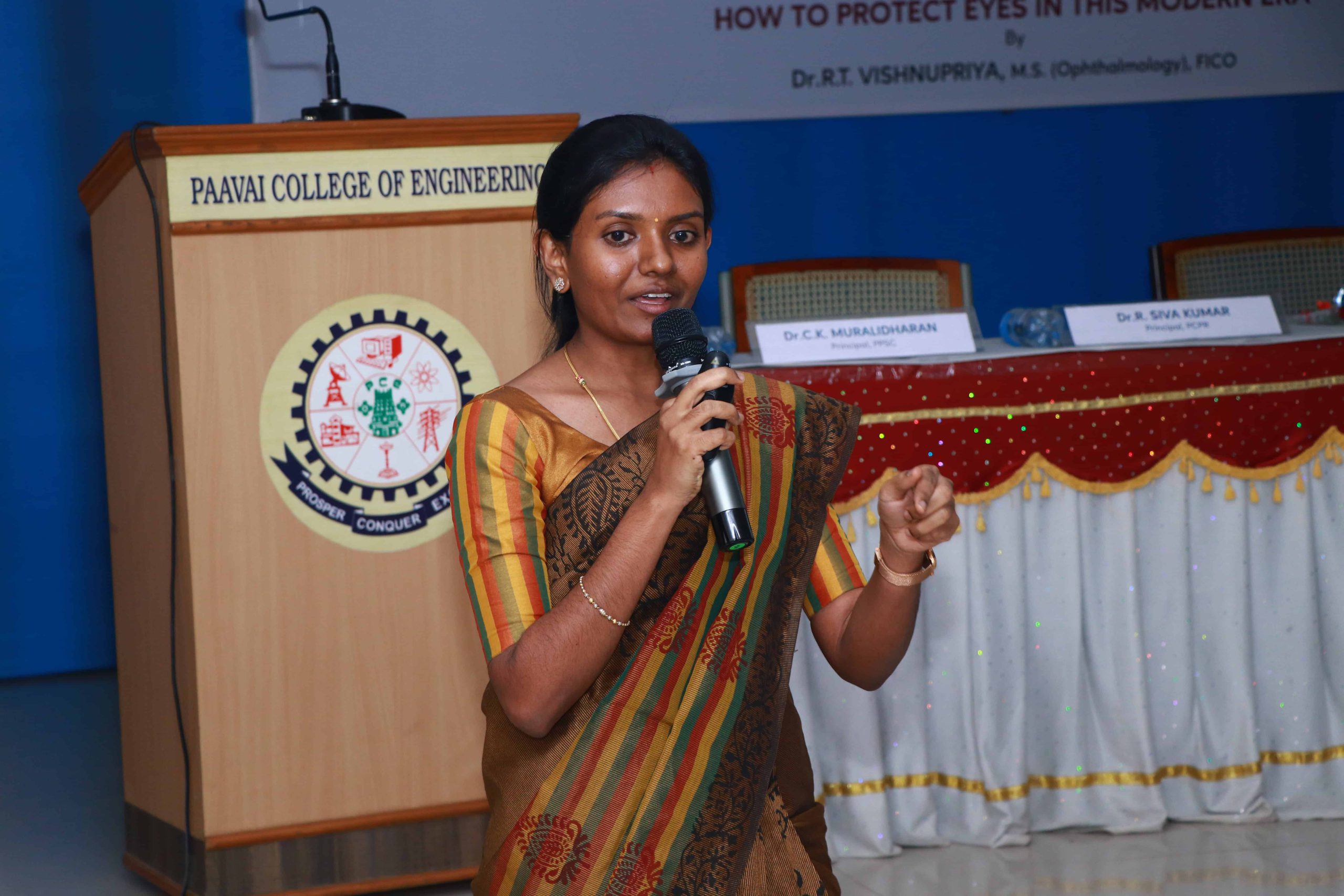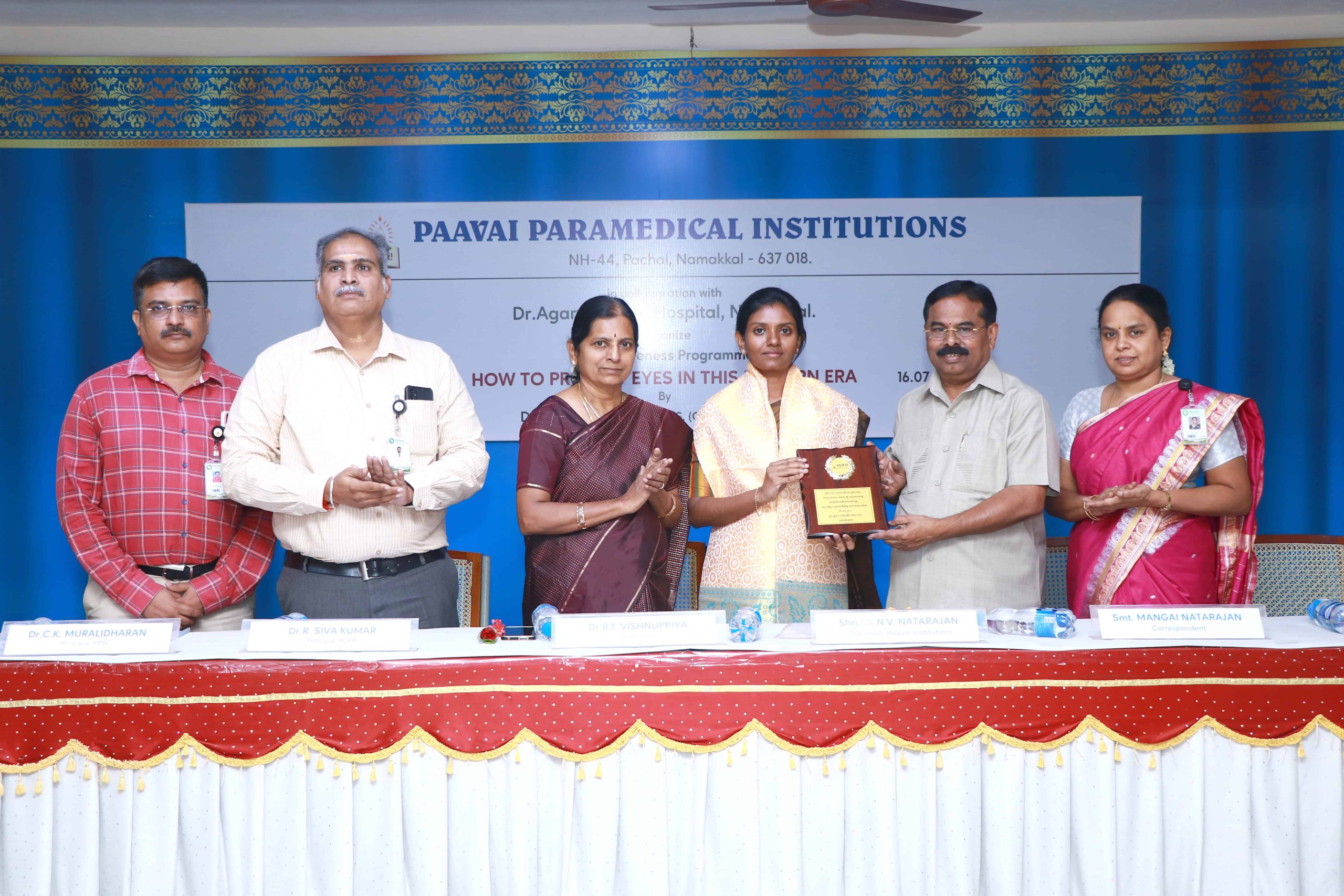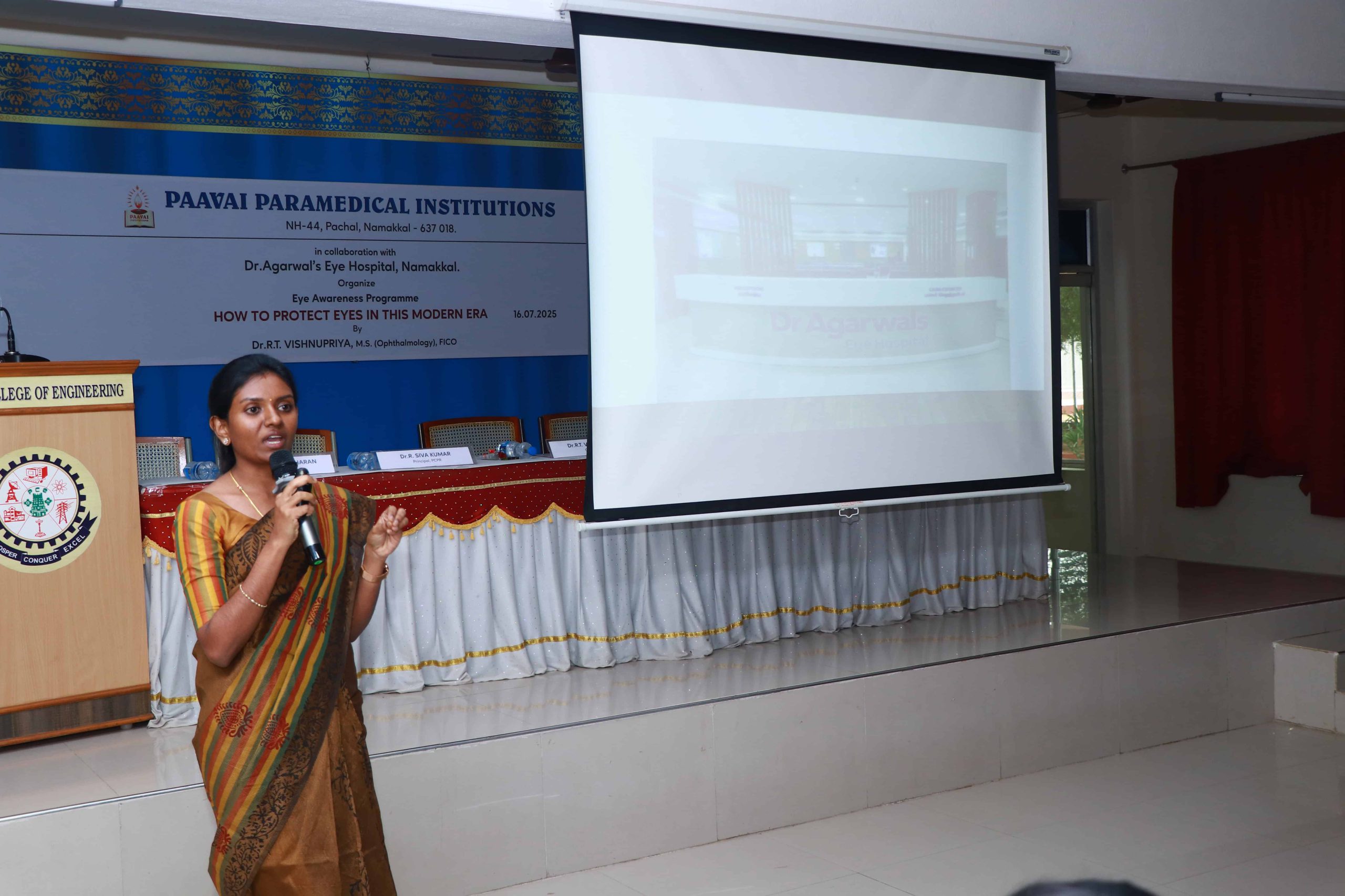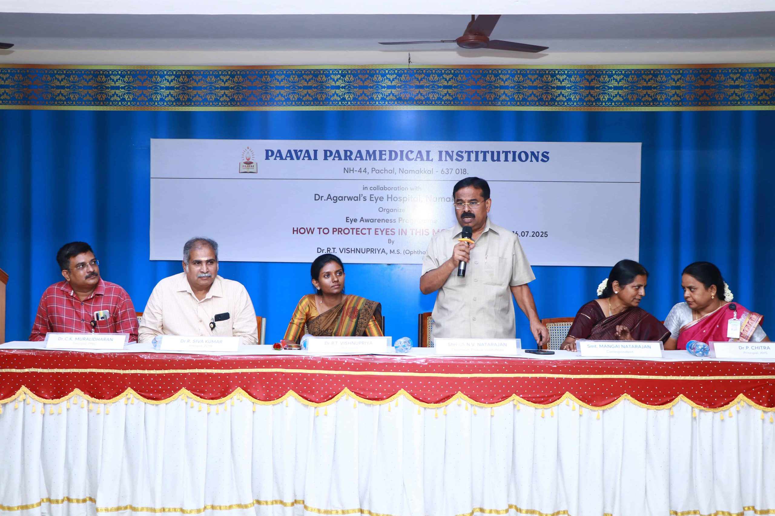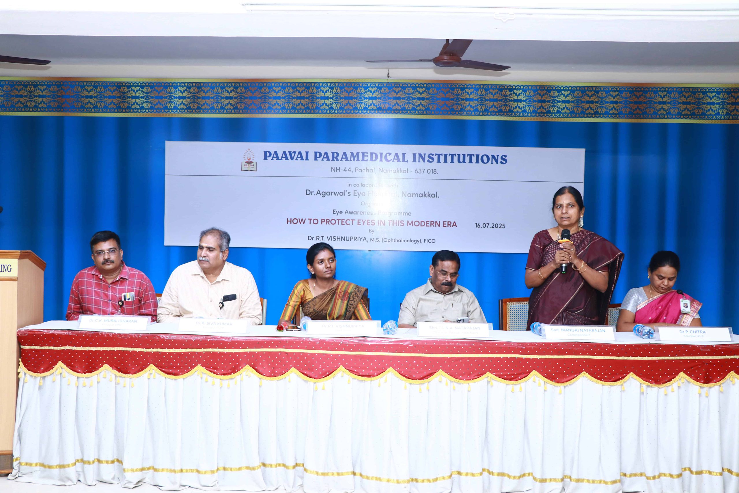Paavai Paramedical Institutions organized an Eye Awareness Program in collaboration with Dr. Agarwal’s Eye Hospital on 16th July 2025, from 2.00 PM to 4.00 PM, at Pragathi Hall, Paavai Institutions, R. Puliyampatti, Namakkal.