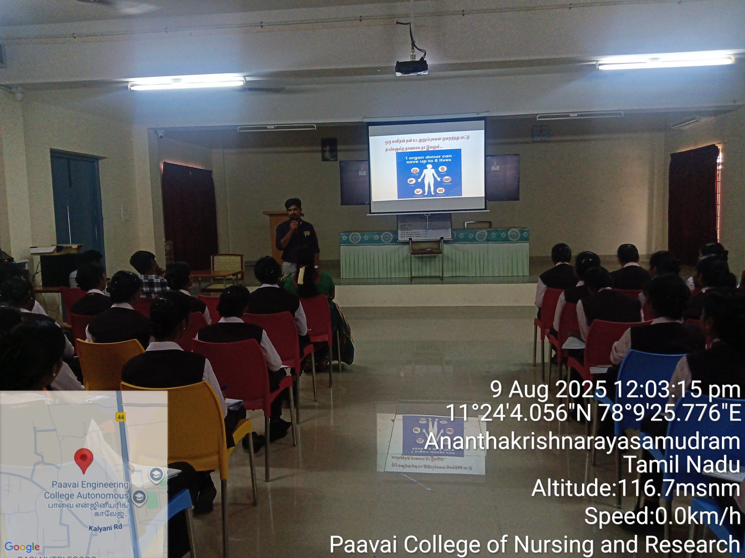 Paavai College of Nursing and Research organized a guest lecture on “Organ Donation” on 9th August 2025. The distinguished guest speaker was Mr. Balasakthi, Organ Transplant Unit Coordinator, Government Medical College and Hospital, Namakkal.
