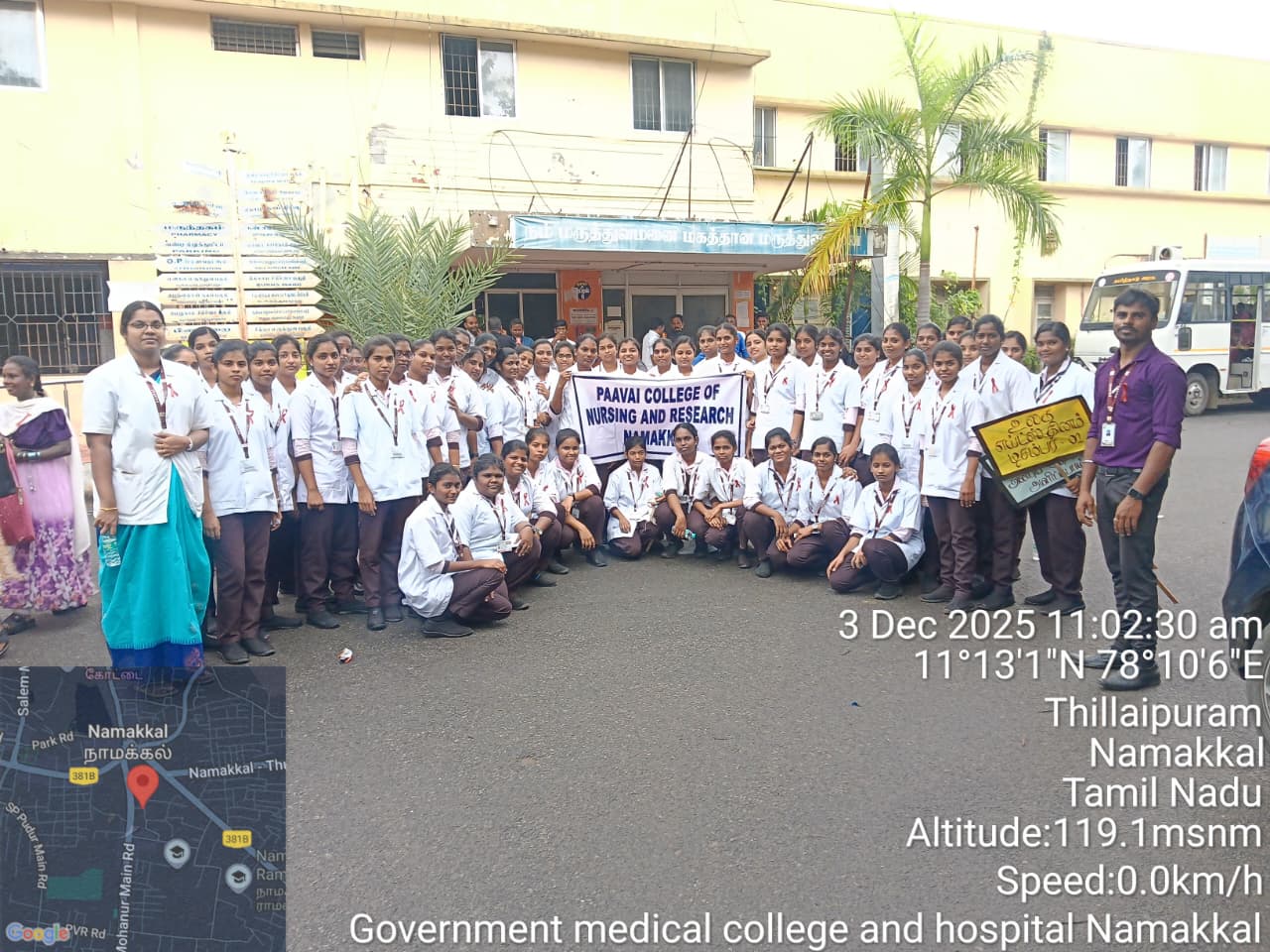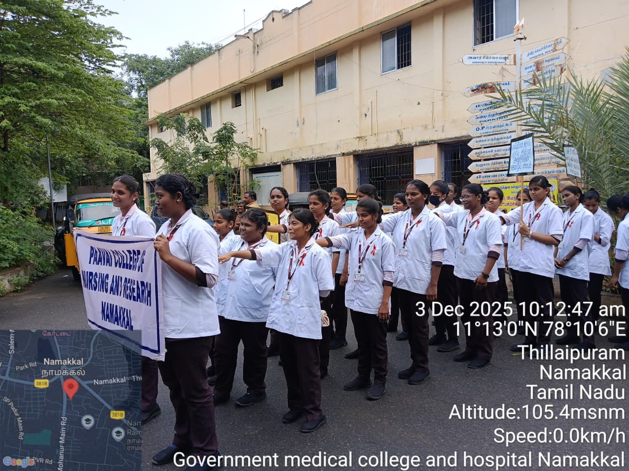 In commemoration of world AIDS Day 2025, students from Paavai college of Nursing and Research participated in a rally conducted by Government Medical College and Hospital on 03.12.2025. The rally was flagged off by the district collector, Mrs. Durgamorthi, IAS, at Namakkal old GH. The events theme was “Over coming disruption: transforming AIDS response” 60 students from 2nd and 5th semesters, accompanied by programme coordinator, prepared and distributed placards on AIDS awareness. The rally proceeded for GH, through trichy road and SBI Street and ended at ld GH. The students were really benefited by the programme.