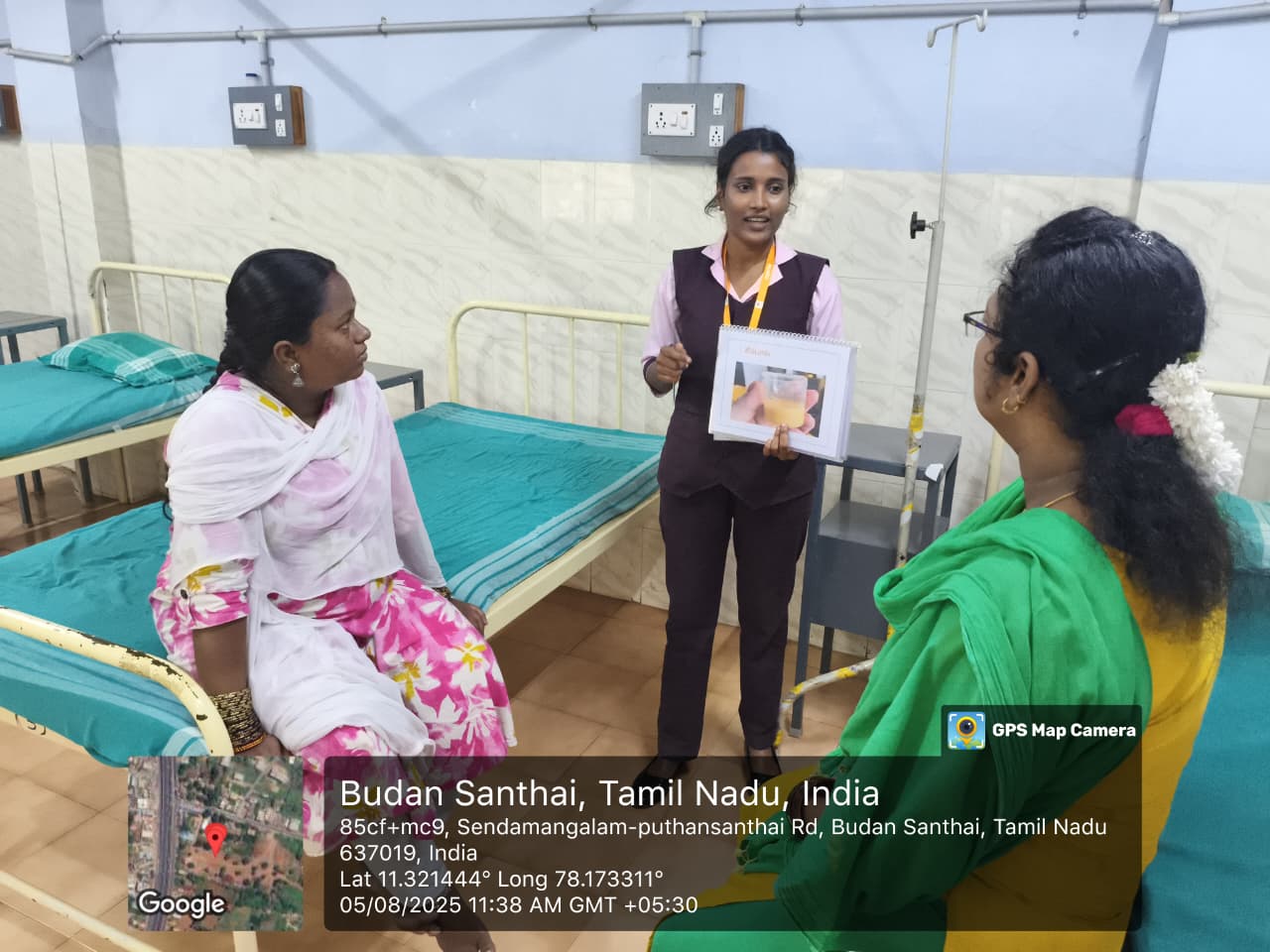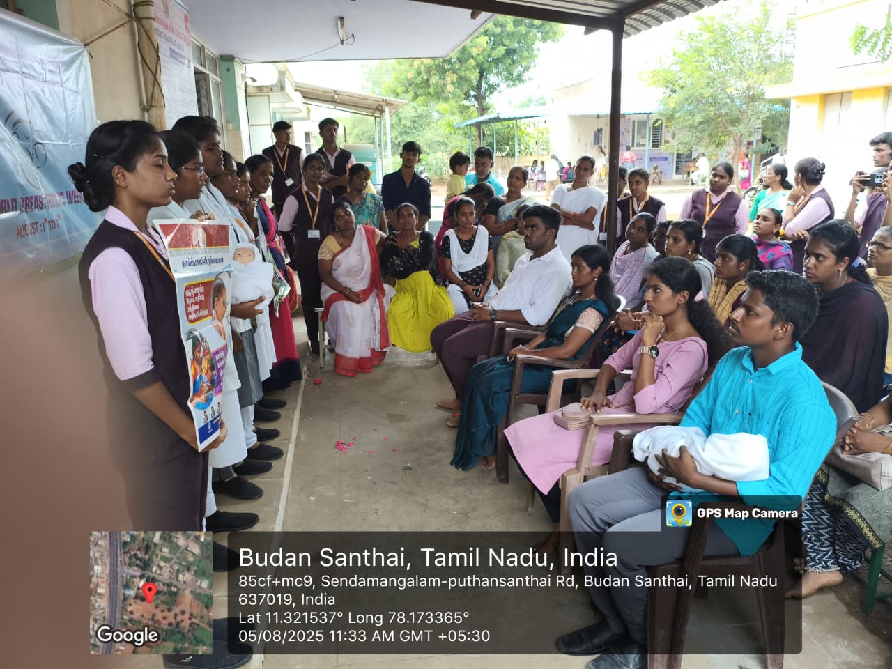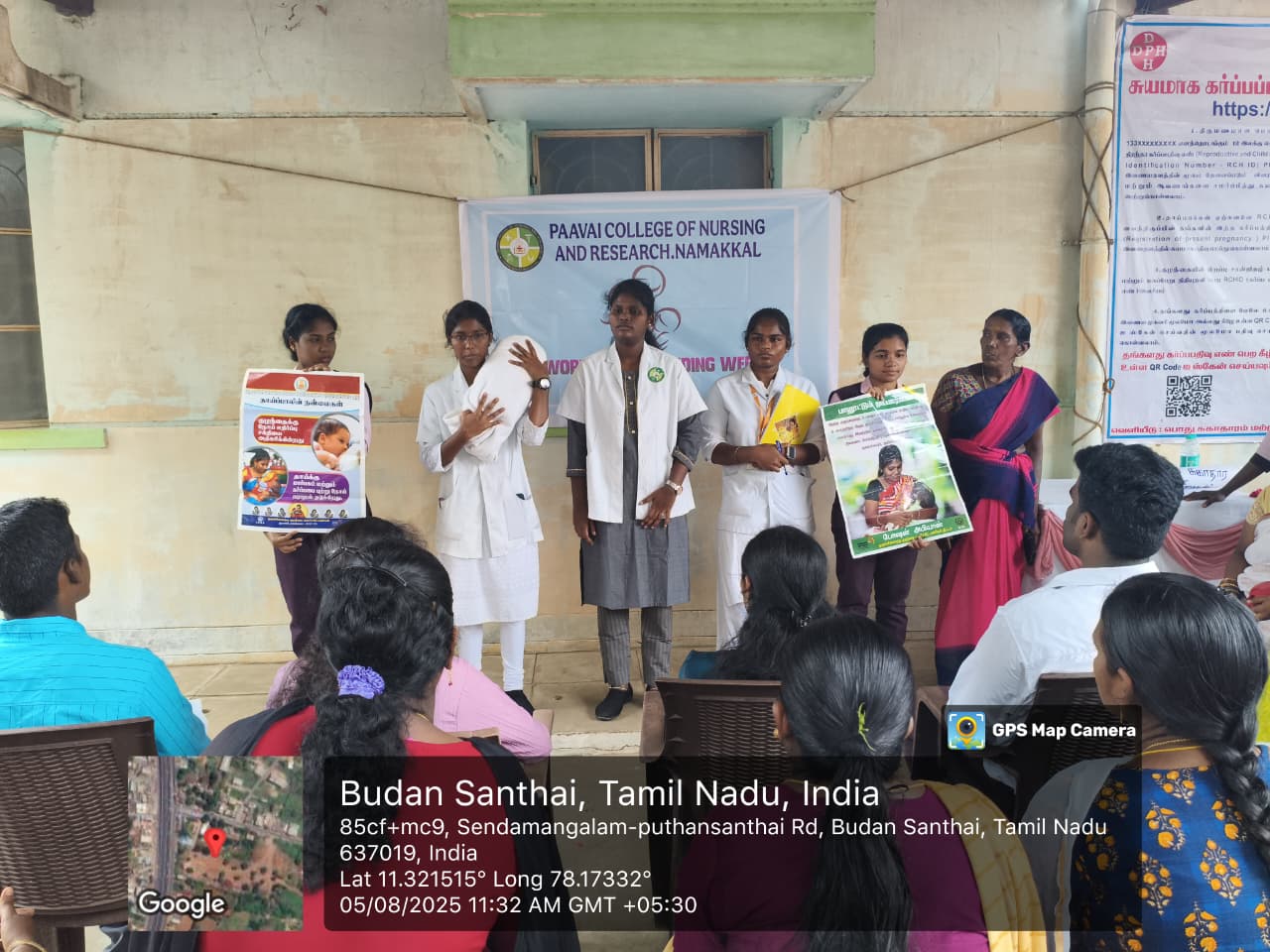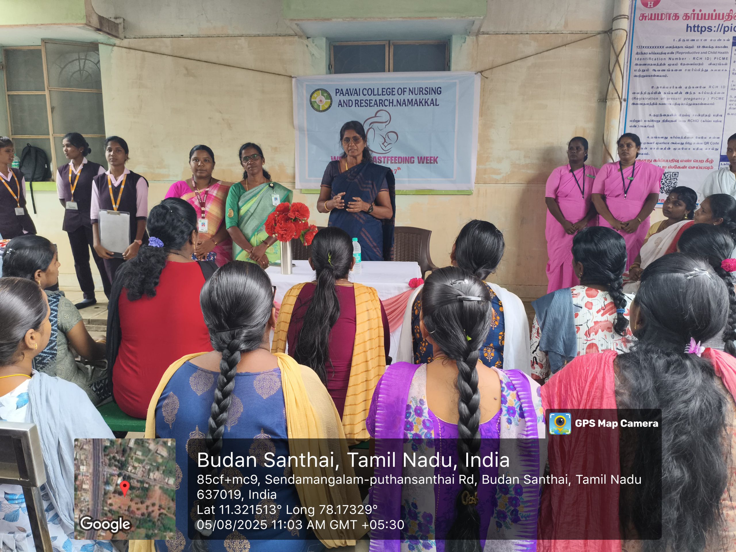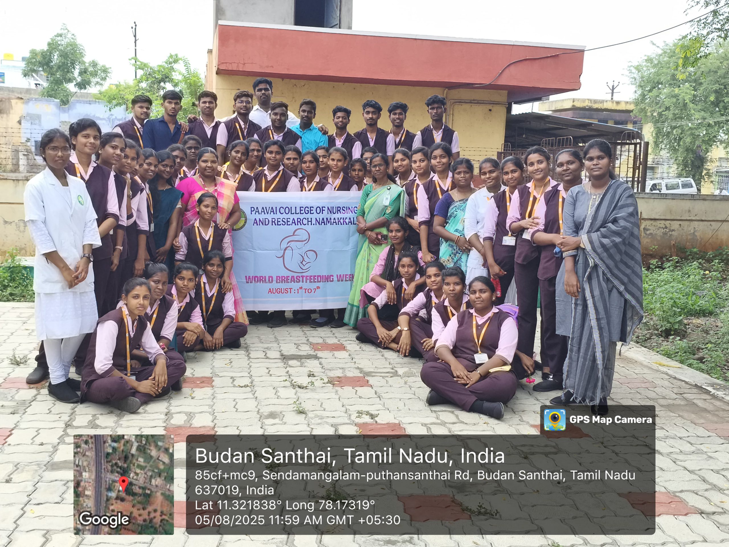 Paavai College of Nursing and Research, Namakkal, organized various health awareness activities as part of World Breastfeeding Week from 01.08.2025 to 07.08.2025. The programs included health education sessions, a nutritional exhibition, poster presentations, role plays, and the distribution of informative leaflets at different hospitals and community areas.